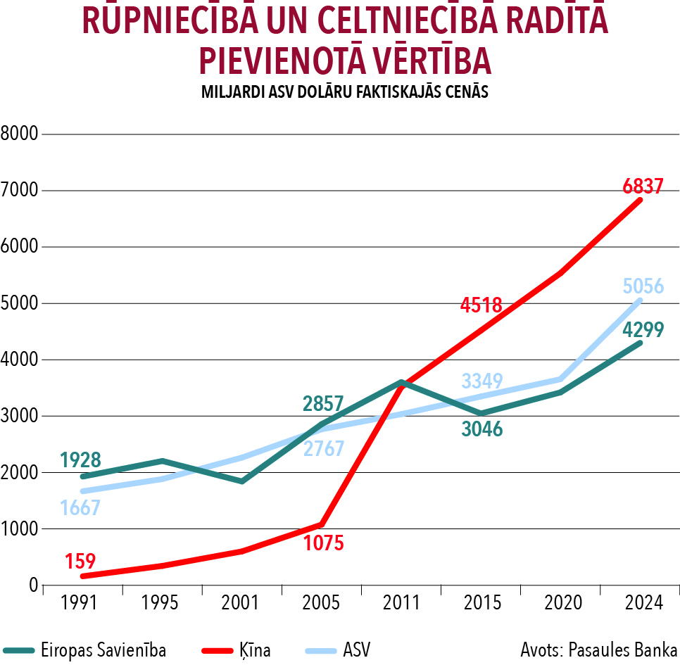 Globālā mērogā tiek mērīta ražošana kopā ar celtniecību. Proti, laikā no 2004. līdz 2023. gadam Ķīnas rūpniecībā un celtniecībā veidotā pievienotā vērtība ir augusi aptuveni 7,5 reizes, bet ASV – tikai nepilnas divas reizes. Tas Ķīnu ir padarījis par vadošo pasaules ekonomiku. ES valstīm klājas vēl bēdīgāk nekā ASV.