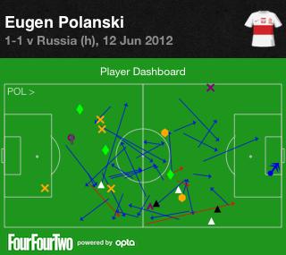 Kā redzam, viņš bija aktīvs kā aizsardzībā, tā uzbrukumā. Pietiek atcerēties to, ka mača 19. minūtē viņš ar gūtiem vārtiem sajūsmināja klātesošos poļu fanus, bet atradās aizmugures stāvoklī - priekšā visiem saviem uzbrucējiem un priekšā Krievijas centra aizsargiem... Neraksturīgi viņam pašam, divreiz pat aizdriblēja garām pretspēlētājam. Nevienam citam Polijas izlasē divi sekmīgi dribli nebija padevušies. Grafikā uzskatāmi redzams, ka aktīvāks Polanskis bija labajā flangā. Tas tāpēc, ka uz viņa pleciem gūlās arī poļu labās malas aizsarga Lukaša Piščeka piesegšana, kad Dortmundes Borussia zvaigzne pieslēdzās uzbrukumiem. Ņemot vērā, ka tajā flangā krieviem darbojās viņu bīstamākais spēlētājs Andrejs Aršavins, piesegšana un zonas noslēgšana bija ļoti nozīmīga. Tas gan neapturēja Aršavinu pavisam, bet manāmi ierobežoja. Zemāk redzamajā attēlā redzam, ka centra līnijas tuvumā Aršavins darbojās krietni precīzāk nekā poļu soda laukuma tuvumā.